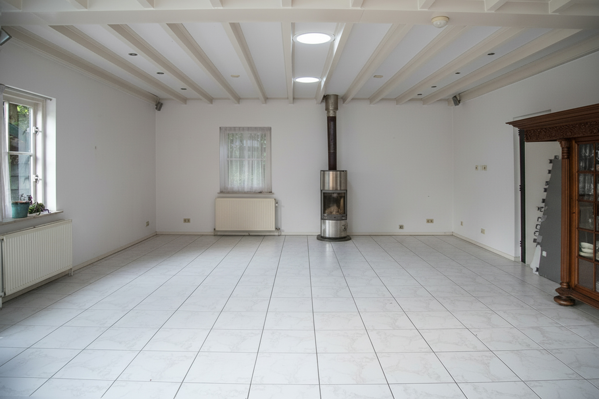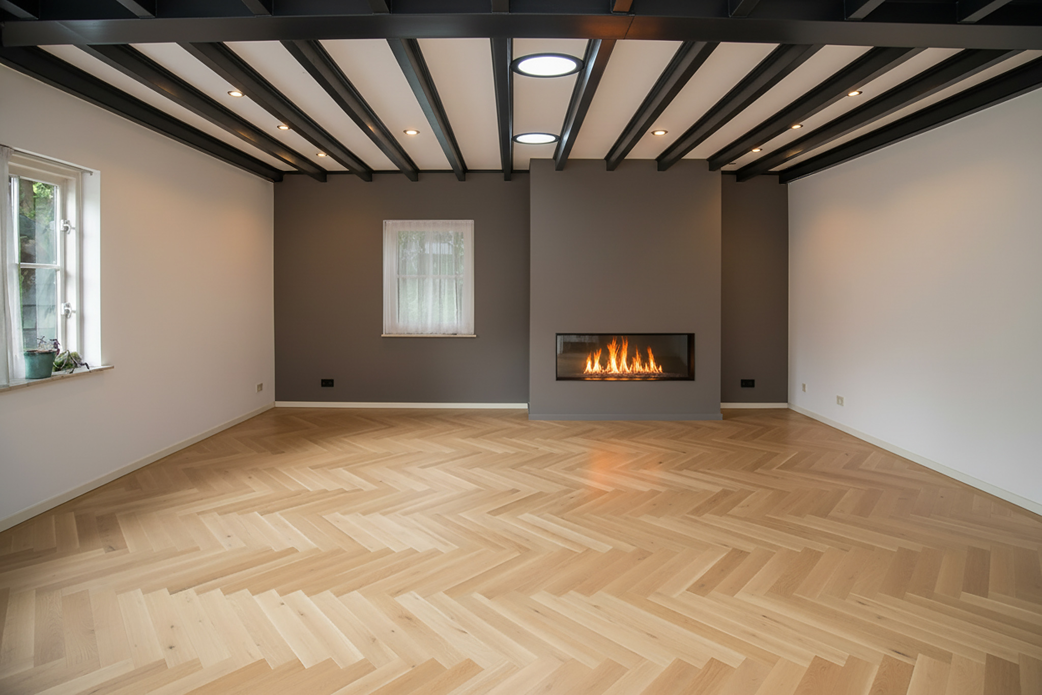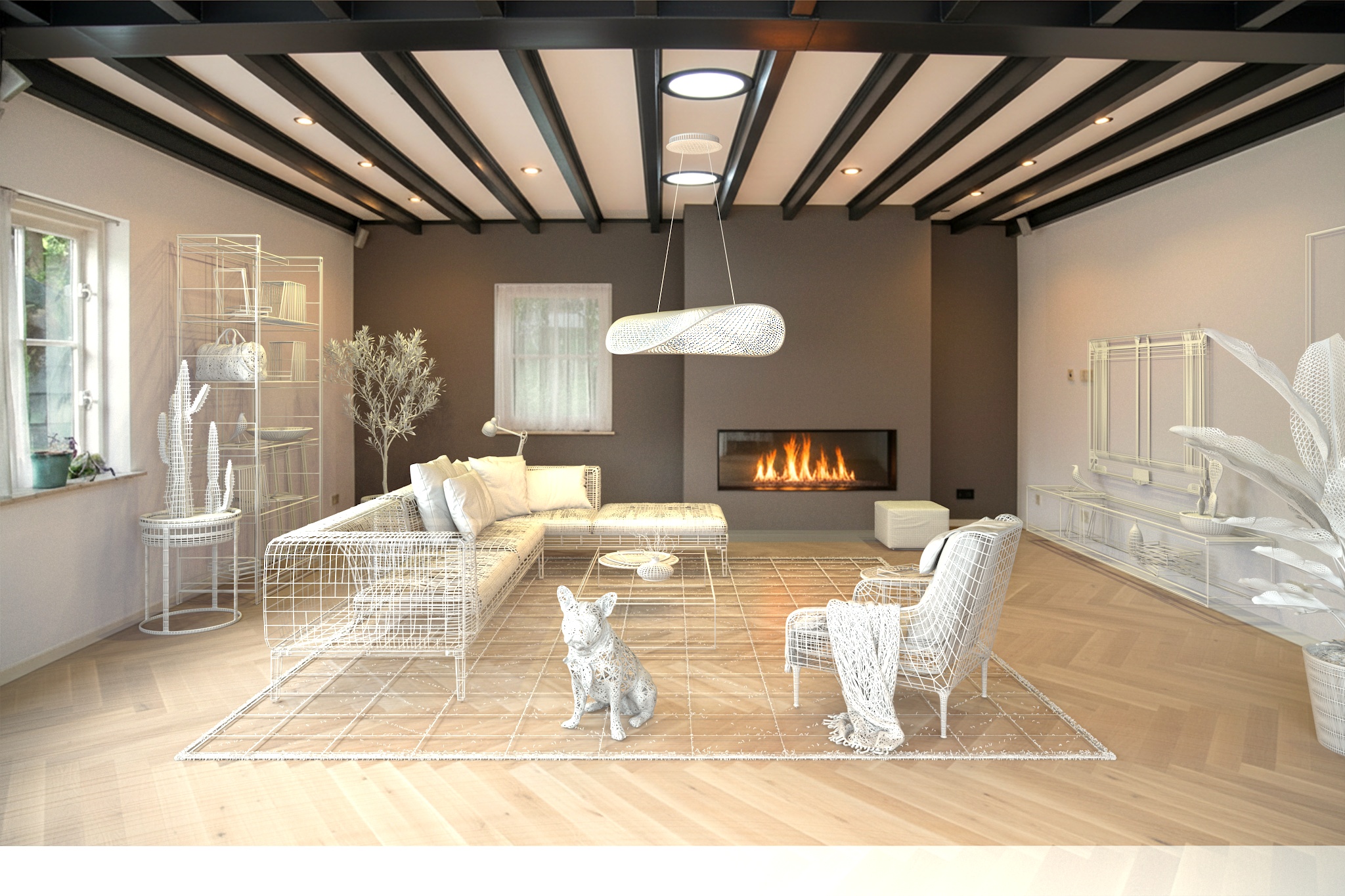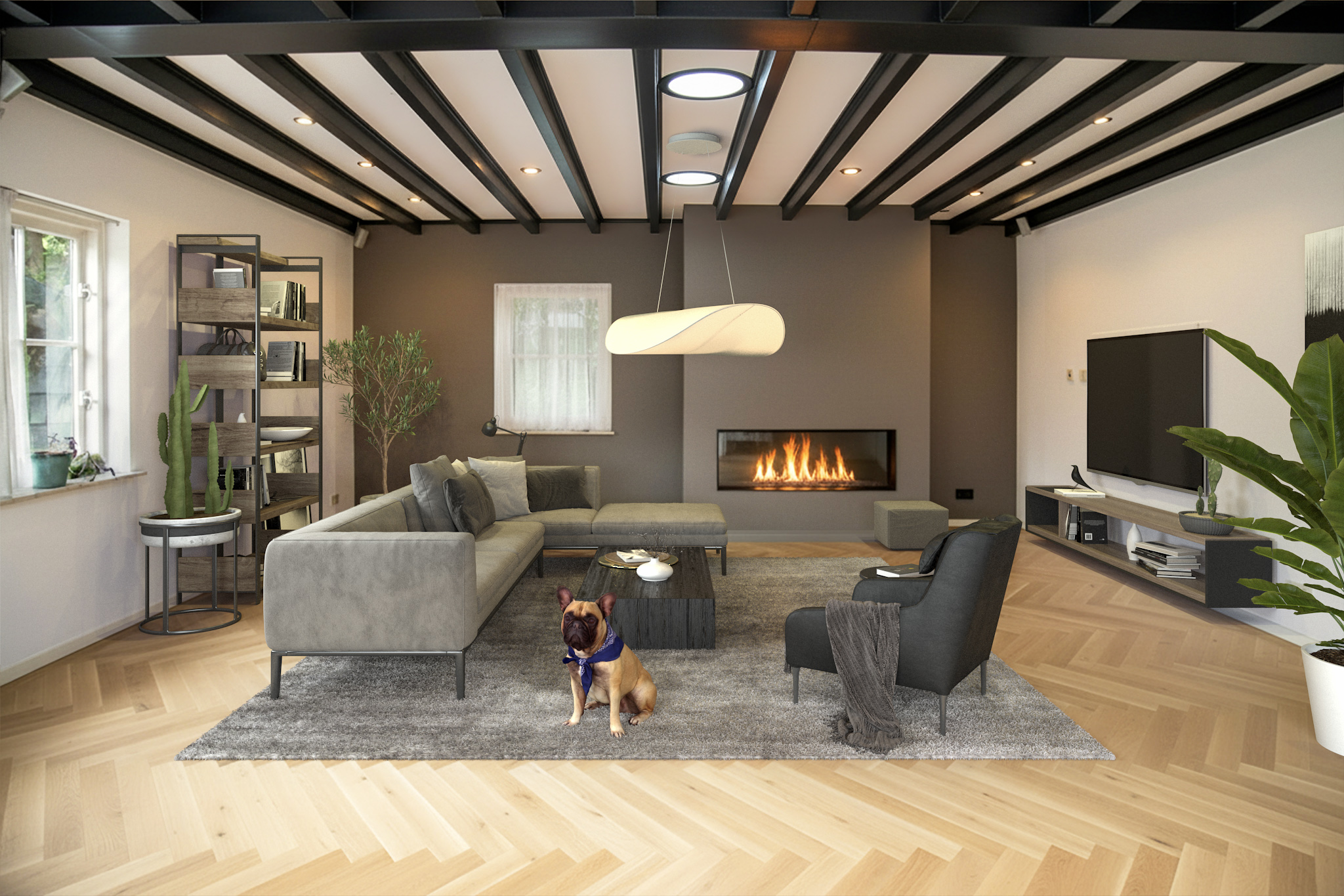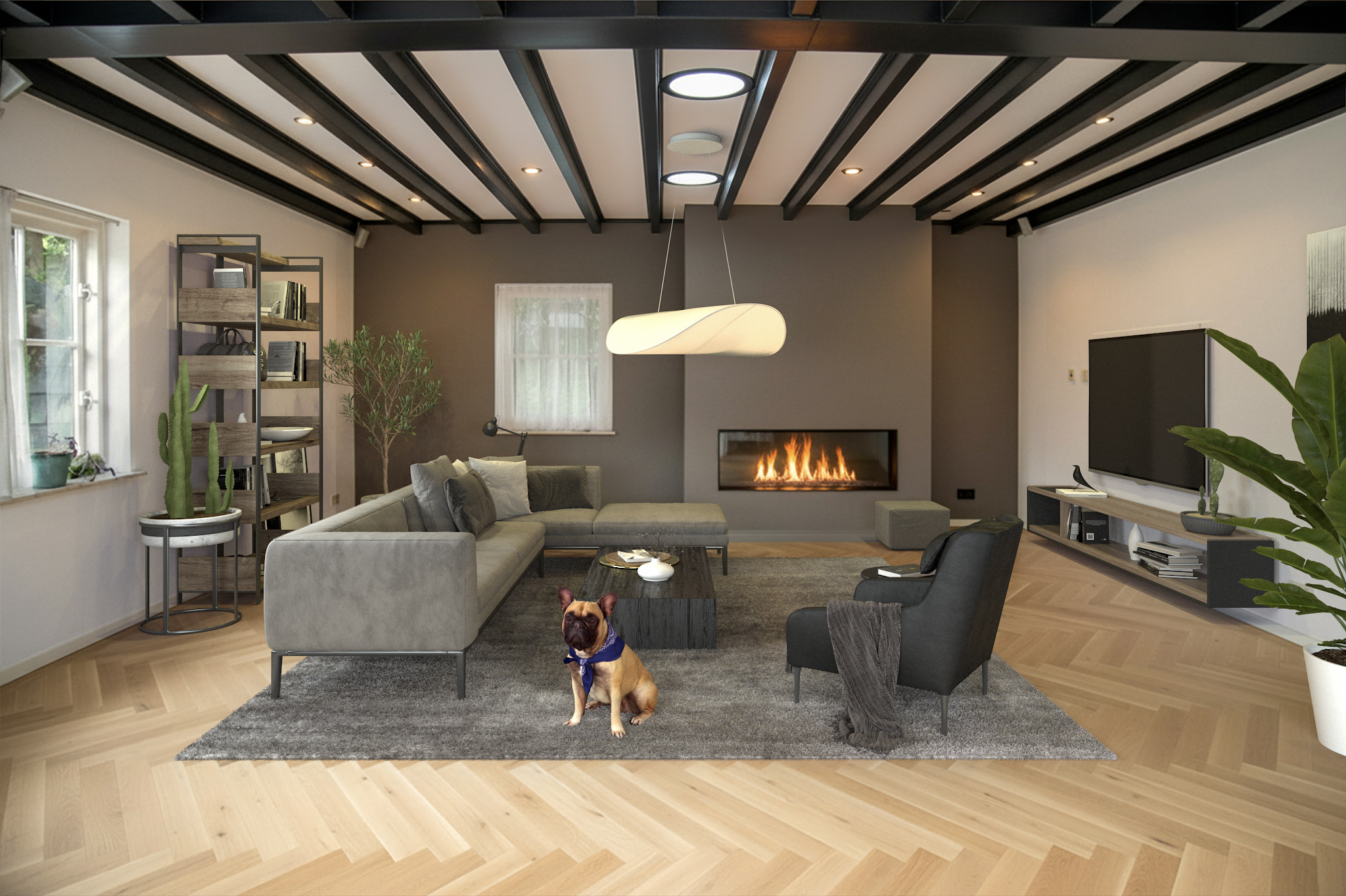 Empty this room by taking away all furniture, paintings, closets, carpet, plants, tatue, lights, tv etc. Leave just an empty room, but keep the architecture untouched. Remove the closet on the right, make it a clean wall with plinth. Remover the speakers attached to the ceiling. Change the floor to ahigh quality wood herringbone oak floor. Remove the heating elements. Paint the walls and ceiling with fresh white paint. Wooden Leave the architecture as is. Also paint the beams white on the ceiling. Change the fireplace to a modern fireplace intergrated into the wall and put the fire on, but leave the the rest of the architecture as is. Place it on the right side. Take away the heating element under the window. Paint the backwall and the new intergrated fireplace to a dark warm gray. Add these furnuture in the image, and make the lighting and shadows correct so it look realistic. Paint the beams on the ceiling black and turn the spots on. Change the outlets on the dark wall to black and the light walls to bright white. Voorbeelden van bovenstaande sfeer impressies worden o.a. toegepast bij interieur, exterieur, vogelvlucht, maatkeukens, zonnestudie, product visualisatie en ander presentatie materiaal. Onder portfolio kunt u verschillende voorbeelden zien van artist impressions.