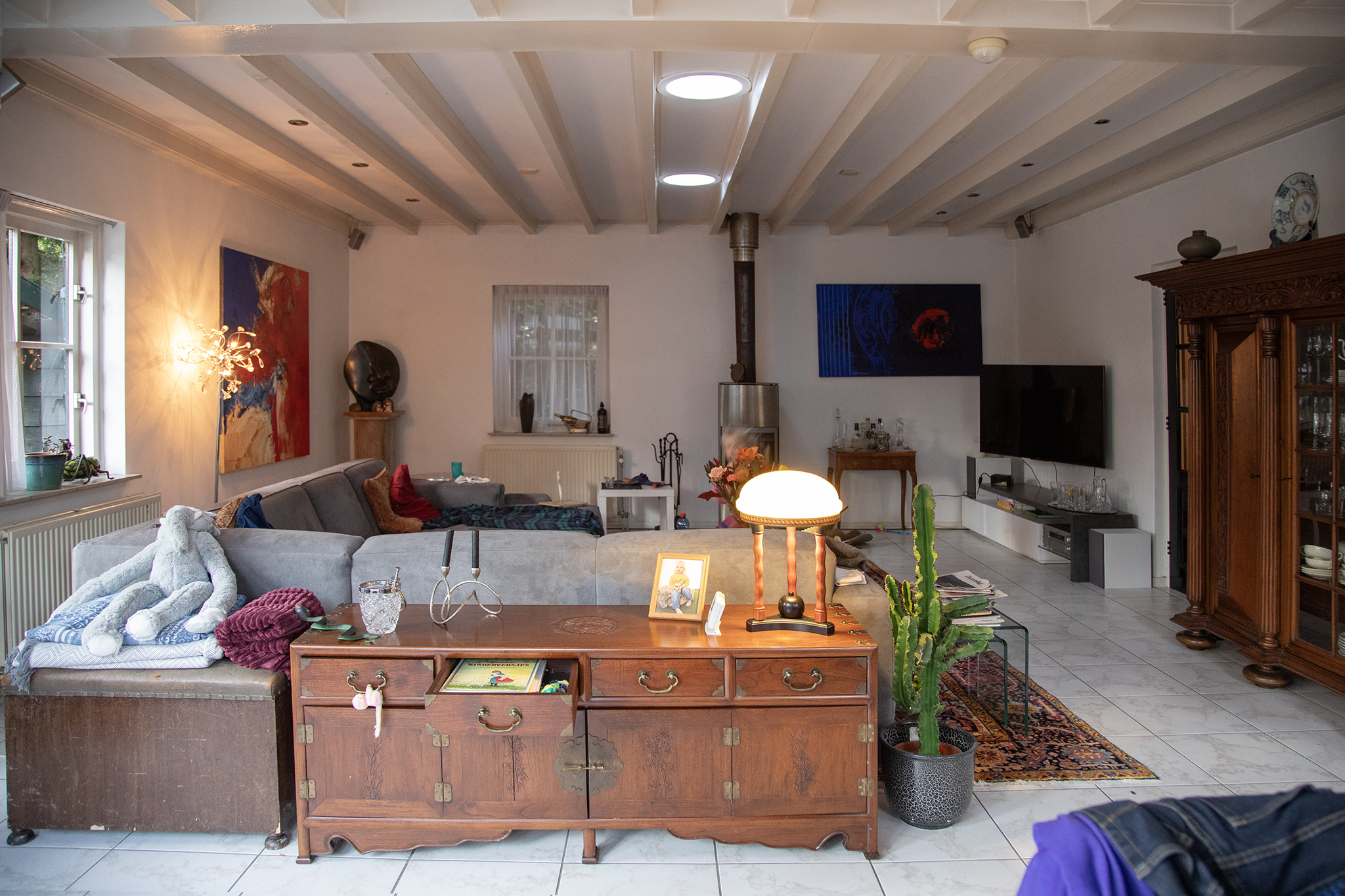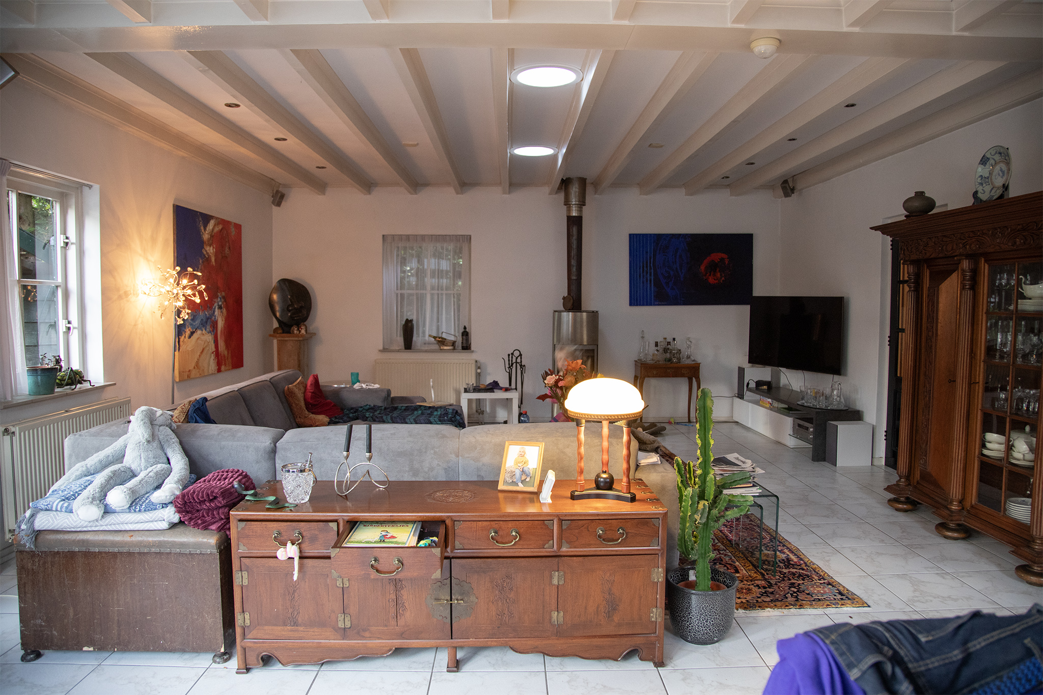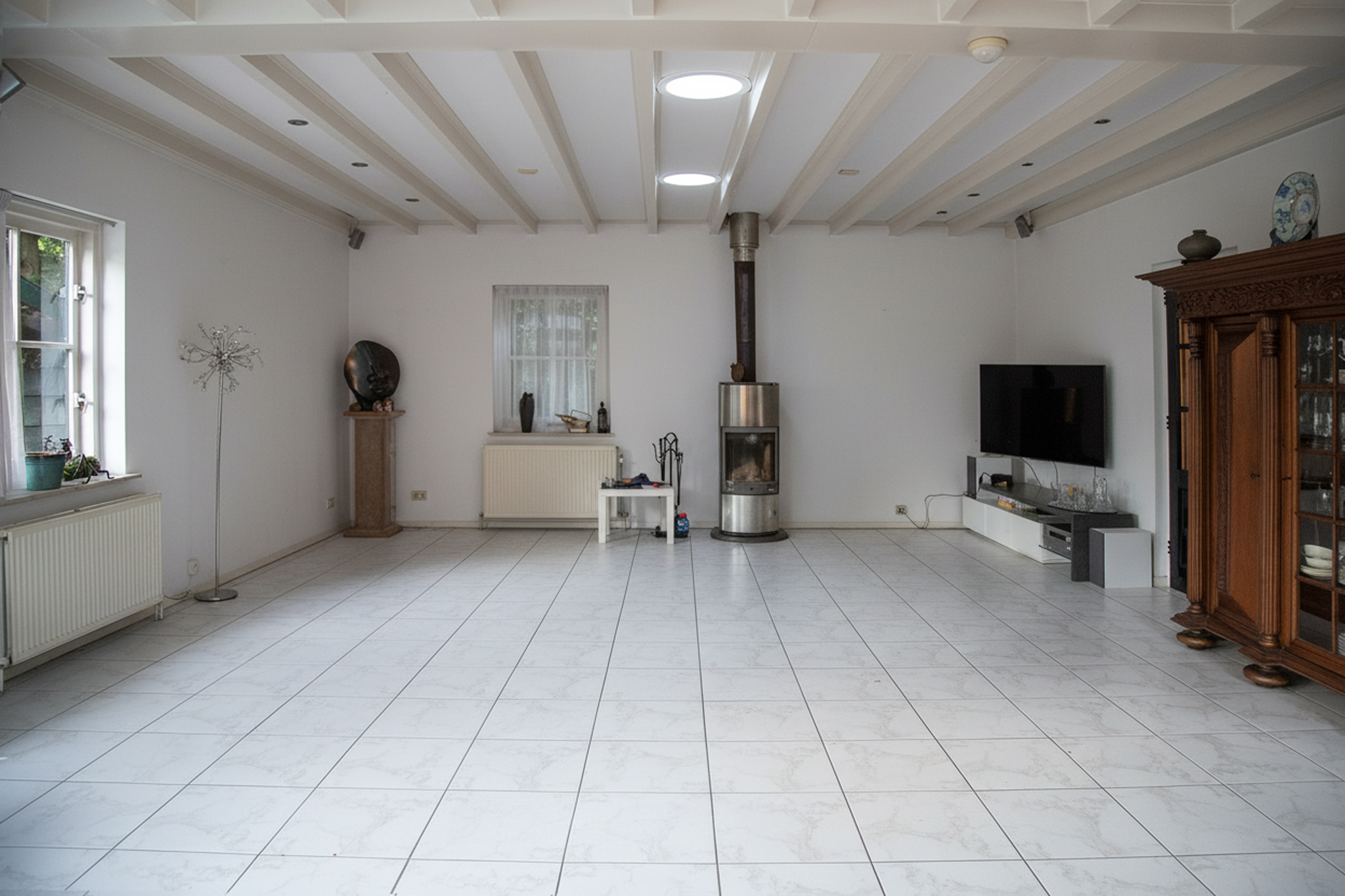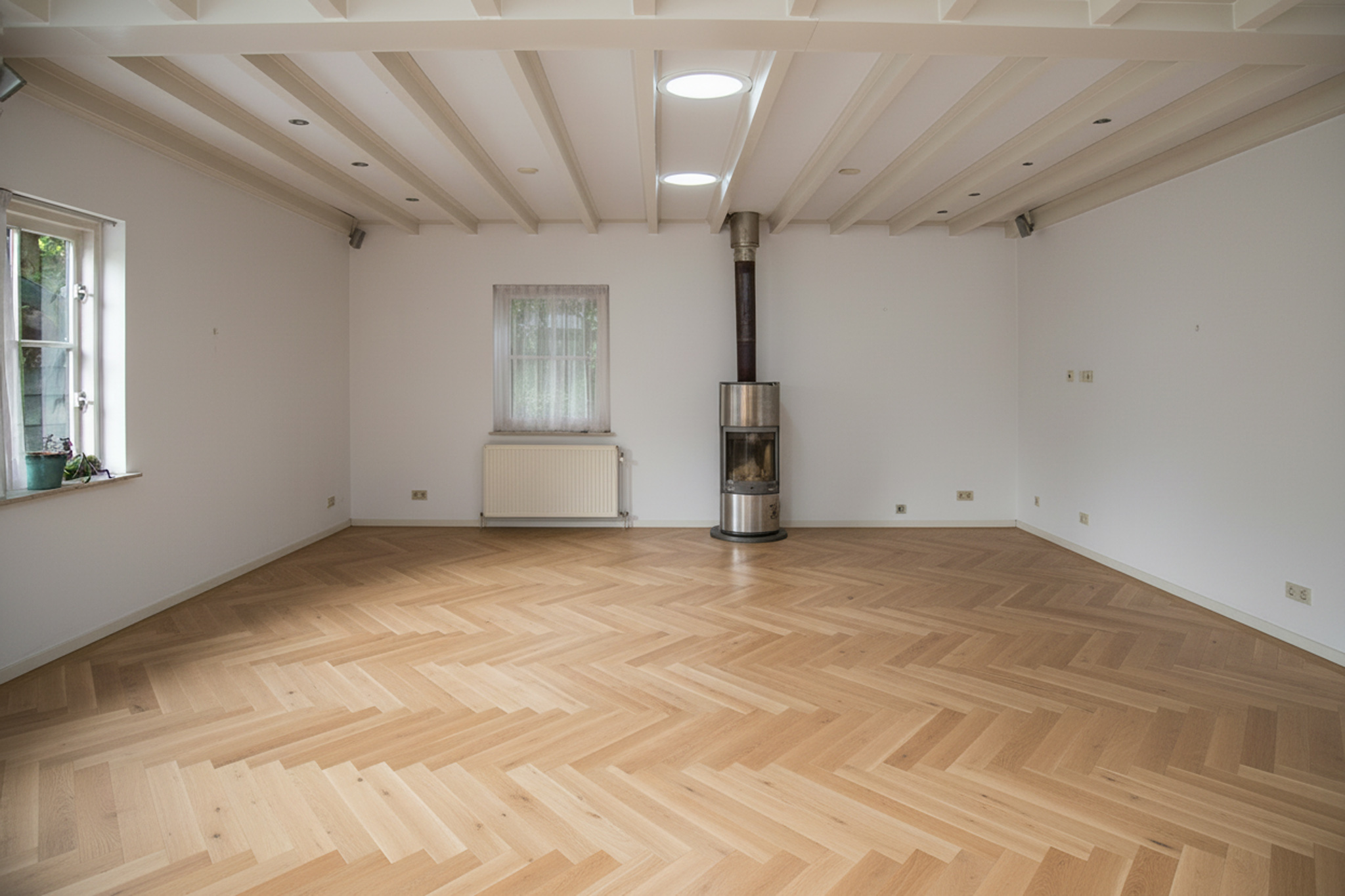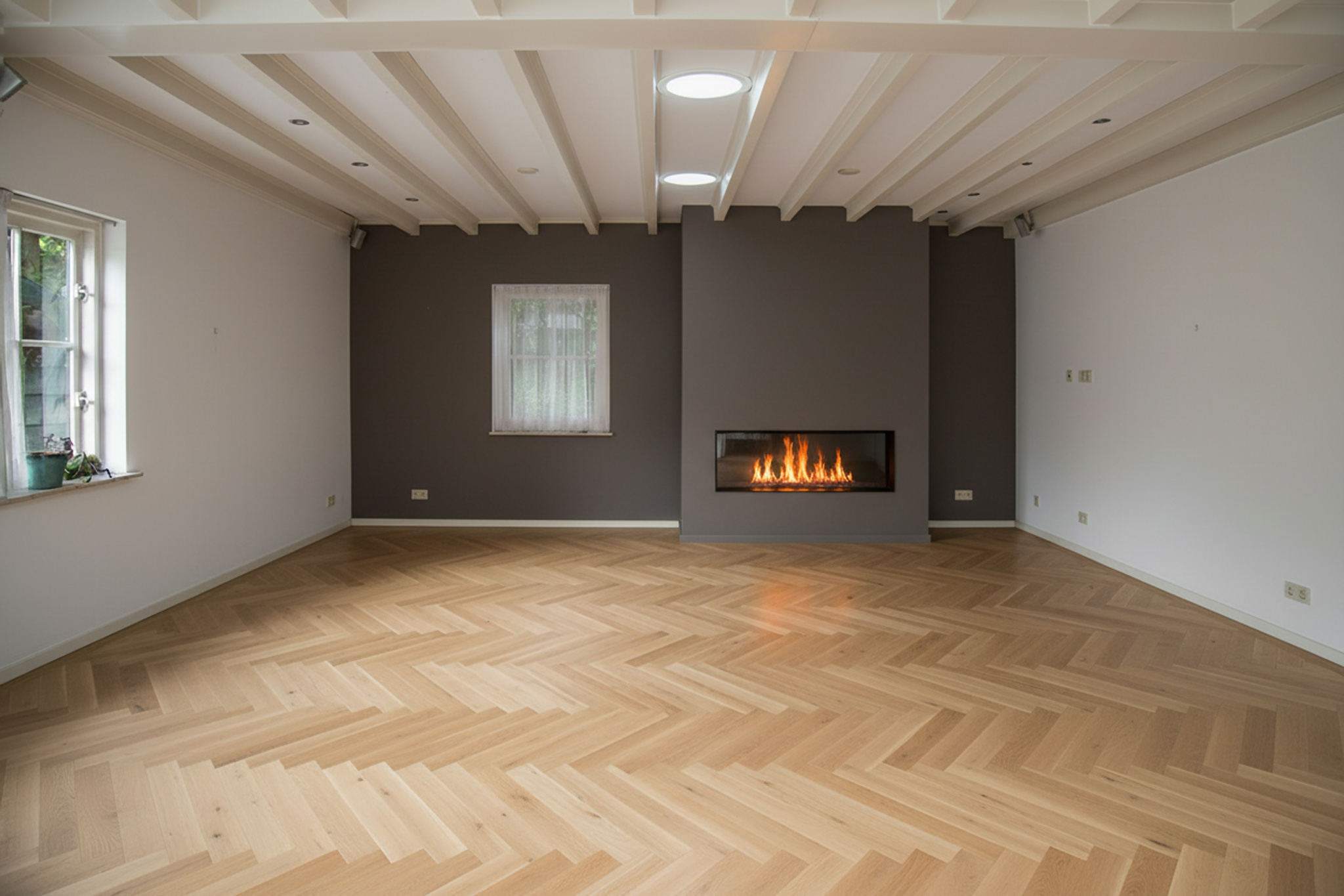 Empty this room by taking away all furniture, paintings, closets, carpet, plants, tatue, lights, tv etc. Leave just an empty room, but keep the architecture untouched. Remove the closet on the right, make it a clean wall with plinth. Remover the speakers attached to the ceiling. Change the floor to ahigh quality wood herringbone oak floor. Remove the heating elements. Paint the walls and ceiling with fresh white paint. Wooden Leave the architecture as is. Also paint the beams white on the ceiling. Change the fireplace to a modern fireplace intergrated into the wall and put the fire on, but leave the the rest of the architecture as is. Place it on the right side. Take away the heating element under the window. Paint the backwall and the new intergrated fireplace to a dark warm gray. Add these furnuture in the image, and make the lighting and shadows correct so it look realistic. Paint the beams on the ceiling black and turn the spots on. Change the outlets on the dark wall to black and the light walls to bright white. Voorbeelden van bovenstaande sfeer impressies worden o.a. toegepast bij interieur, exterieur, vogelvlucht, maatkeukens, zonnestudie, product visualisatie en ander presentatie materiaal. Onder portfolio kunt u verschillende voorbeelden zien van artist impressions.