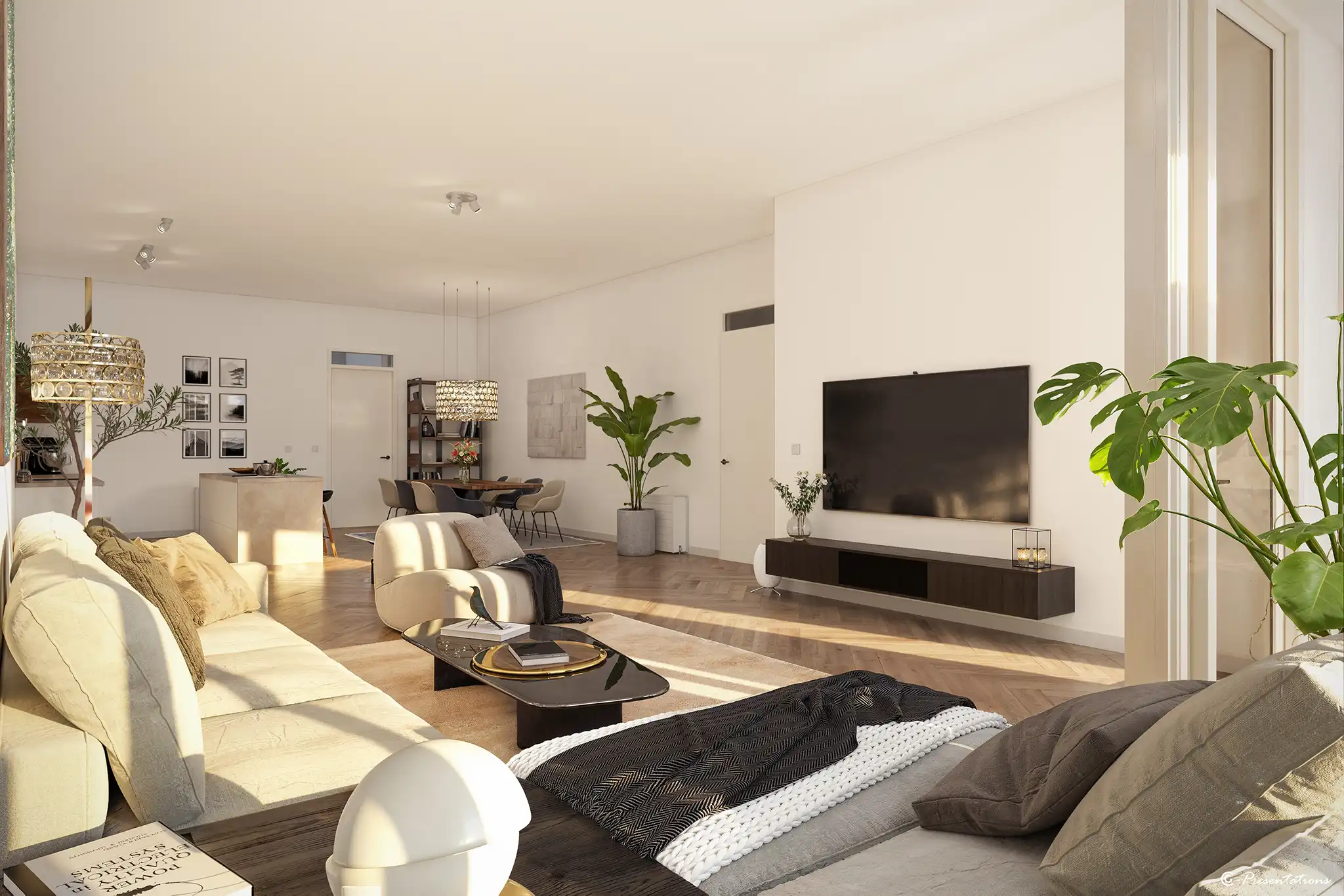 In dit project zijn zowel de keuken als de woonkamer uitgewerkt in fotorealistische impressies. Door aandacht te besteden aan materiaalgebruik, kleur, belichting en meubelopstelling ontstaat een realistisch beeld dat de verbeelding van de kijker activeert.